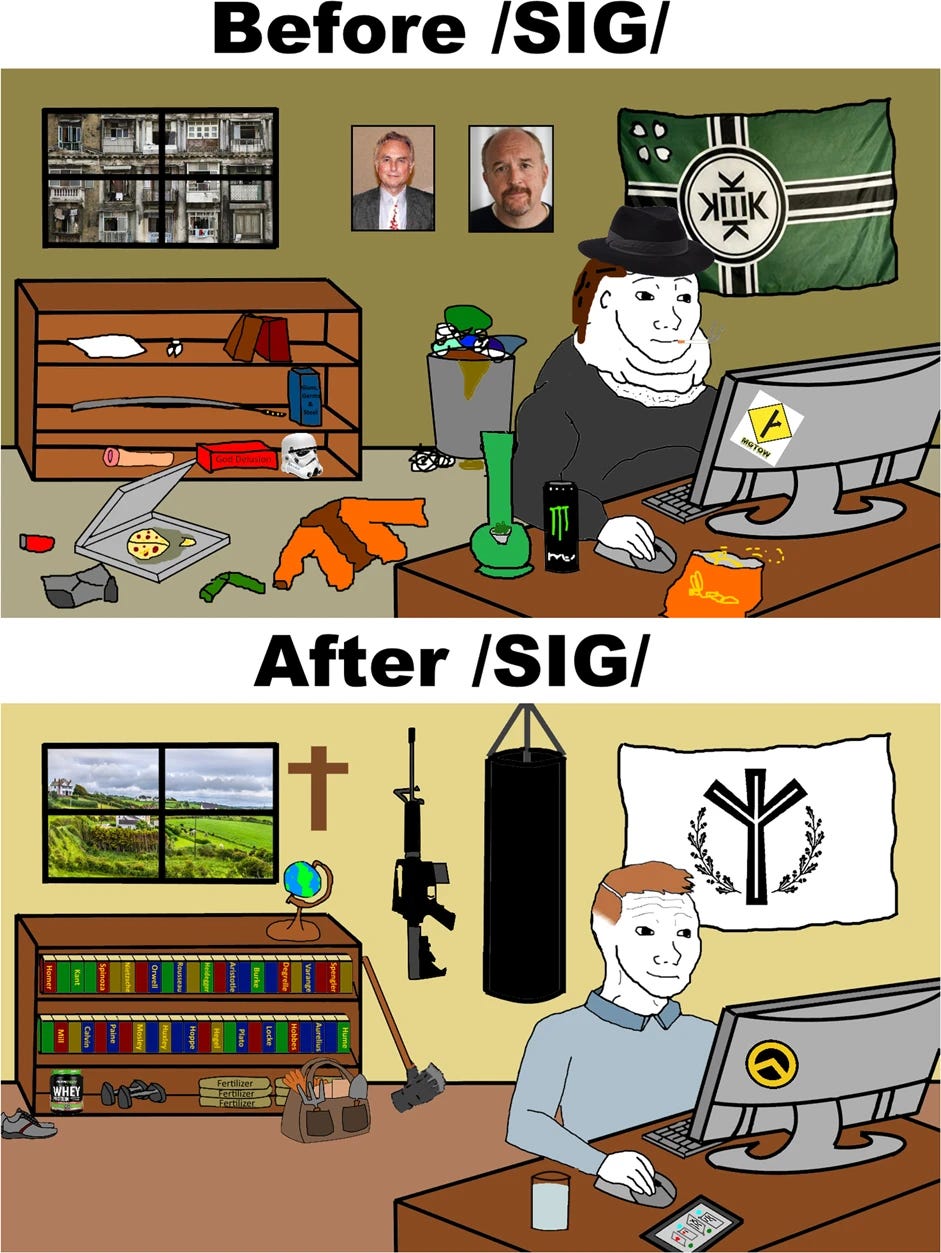 Hence, the neo-Nazis espousal of self-improvement. Dissatisfied and isolated in their lives, perhaps, power-users of 4chan may have be drawn to the inner circle of 4chan for some sense of community, only to discover that this community cannot and has no interest in improving the conditions that brought you there. Unless, of course, there is yet a deeper inner circle that can do this. As Elley (2021) documents, neo-Nazis online have formulated an extension of the traditional fascist vision of the “New Man:” the reformed and radicalized ex-loser who through exercise, self-work, and, coincidentally, adoption of neo-Nazi ideas, becomes a winner, gets the girl, and destroys his (racial and political) enemies. When one takes this “iron pill” is taken, the dumbbell becomes a rhetorical device, each curl bringing the reader into greater identification with the “physically fit, handsome, sociable, successful, hygienic, happy, independent, proud, capable and competent” Nazi.